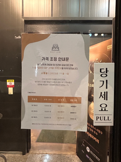 들어가는 입구에 가격 조정안내문이 붙어있다.